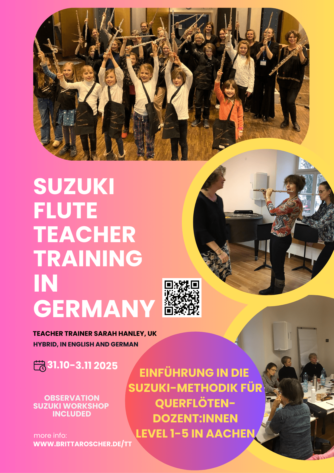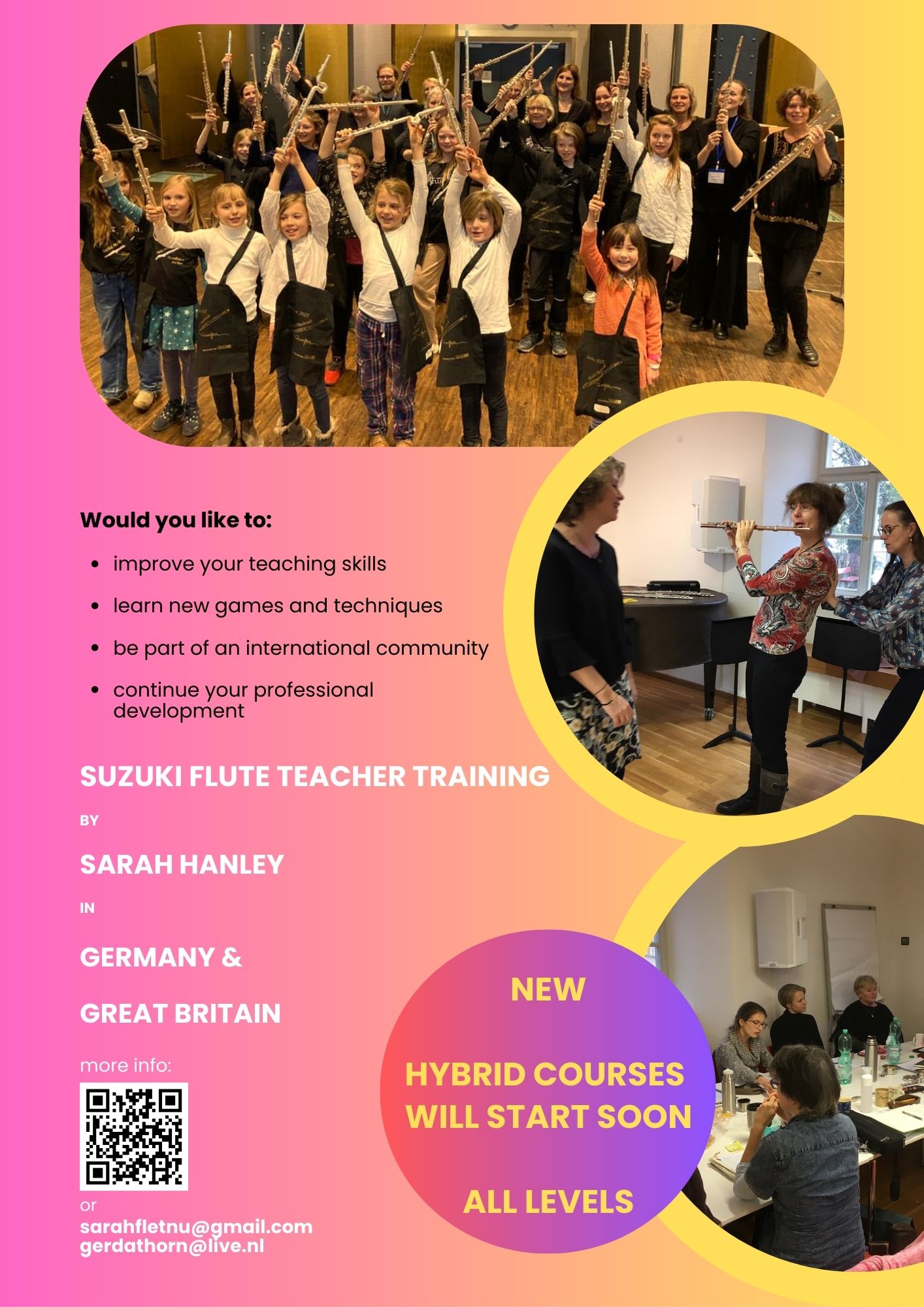 Das Suzuki Flute Teacher Training mit Sarah Hanley wird in Übereinstimmung mit der European Suzuki Association (ESA) hybrid stattfinden.